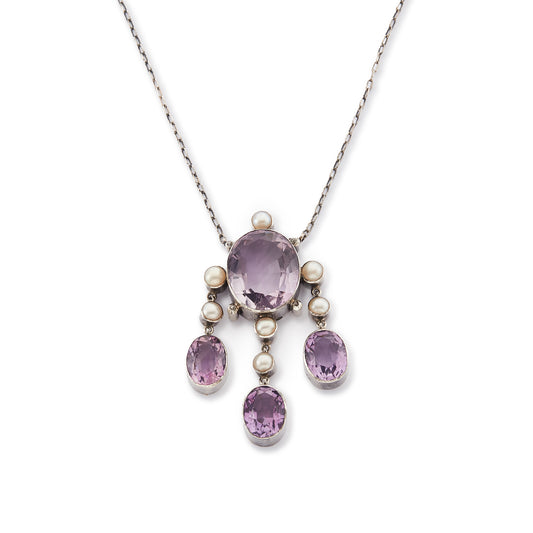 Arts and Crafts Silver Amethyst, Pearl and Diamond Necklace