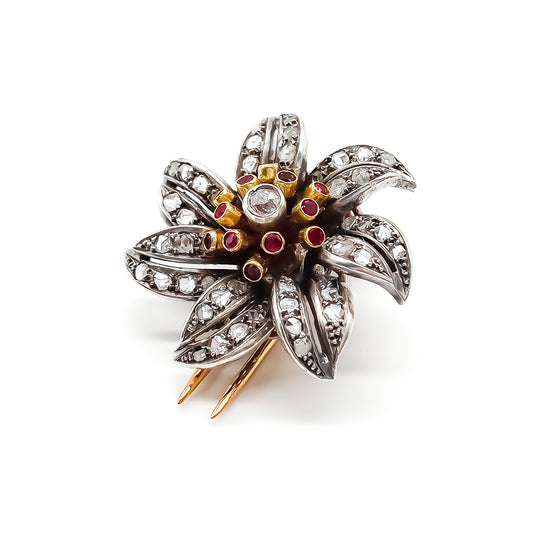 18ct Rose Gold and Silver Diamond and Ruby Clip Brooch
