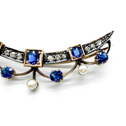Victorian 9ct Rose Gold Diamond, Sapphire and Pearl Brooch