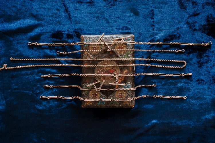 Figaro, curb, box, cable, muff, book, rope, belcher, paperclip, mesh…there are so many beautiful types of antique chains. Fob chains were historically used to secure pocket watches to a wearer's clothing. Long guards were worn as necklaces or doubled up to secure multiple items, such as lockets, keys, or lorgnettes.